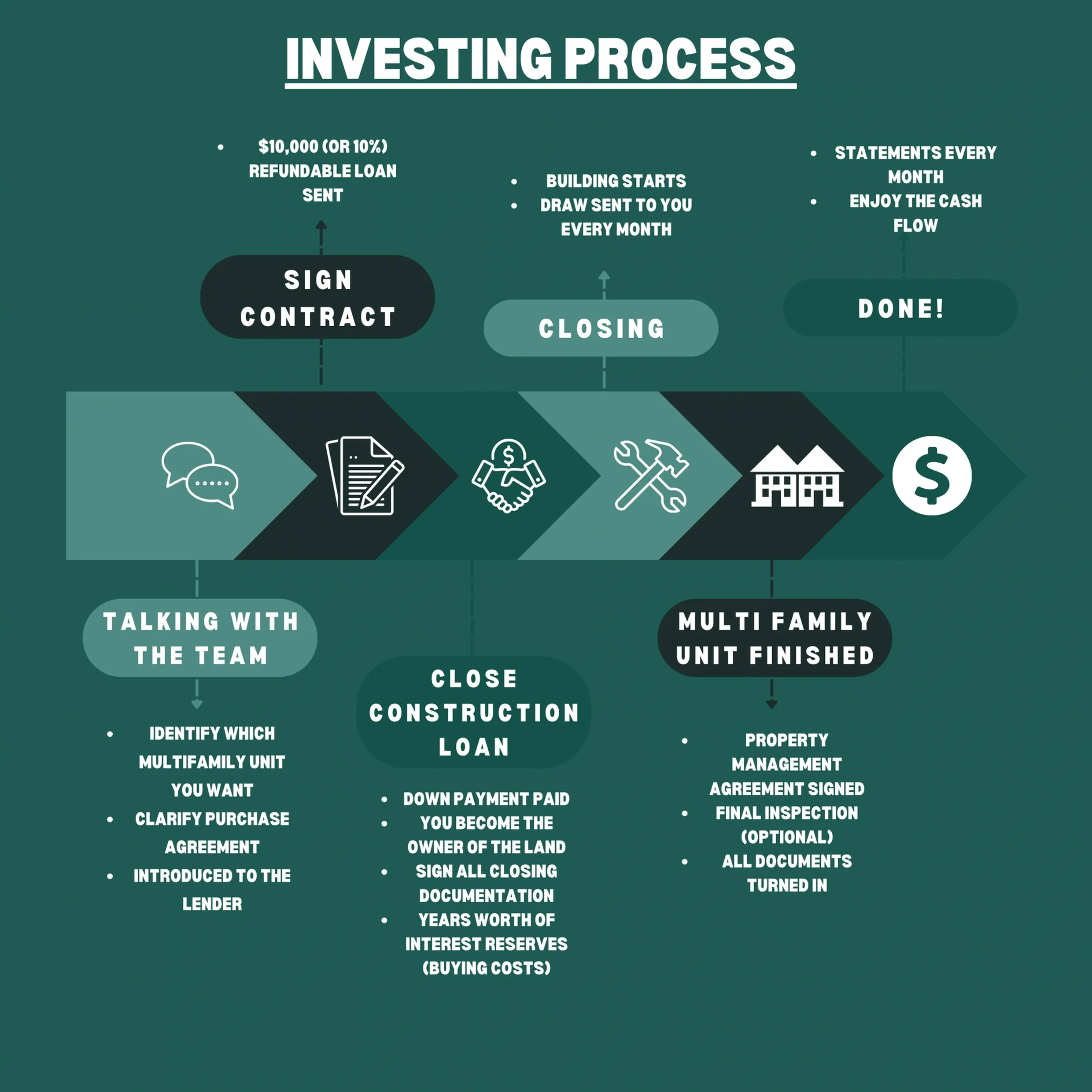 Sign a purchase agreement. Wire a deposit of $10k or 10% of the investment.